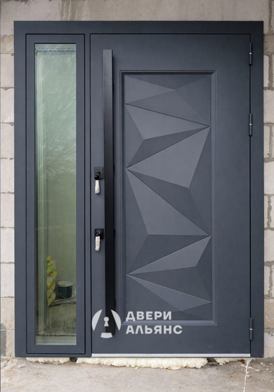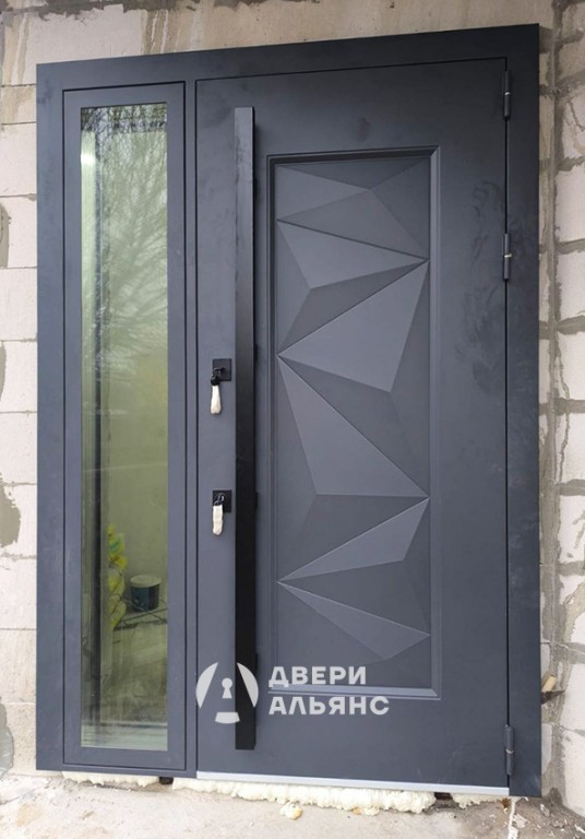 Входная дверь с стеклопакетом в коттедж - СТ 68. Данная модель входной двери представляет собой надежное и стильное решение для коттеджа. Порошковая покраска RAL 7024 придает двери элегантный и современный вид, устойчивый к атмосферным воздействиям и механическим повреждениям. Штамп на металле, выполненный в виде рисунка, служит дополнительным декоративным элементом, подчеркивающим индивидуальность конструкции. Бугельная ручка, установленная вертикально, обеспечивает удобный и надежный захват, что особенно важно в зимнее время года. В сочетании с двумя замками Guardian, такая ручка повышает уровень безопасности и защиту от несанкционированного проникновения.
