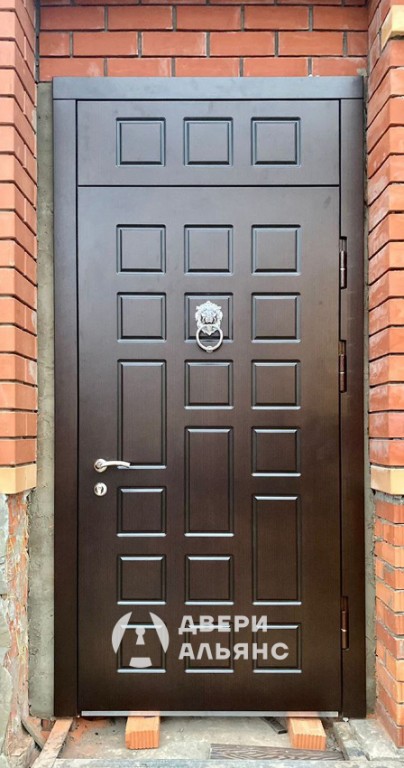 Фрамуга, являющаяся неотъемлемой частью данной модели, придает двери дополнительную эстетическую привлекательность и функциональность. Она позволяет увеличить высоту дверного проема, улучшая освещенность прихожей и придавая интерьеру более величественный вид. Декоративное оформление фрамуги гармонично дополняет общий дизайн двери. Стильный внешний вид двери подчеркивается четкими линиями филенчатой отделки и элегантной фурнитурой. Львиная голова в качестве дверного молотка добавляет нотку роскоши и респектабельности, свидетельствуя о безупречном вкусе владельцев. Надежная конструкция и качественные материалы гарантируют безопасность и долгий срок службы.
